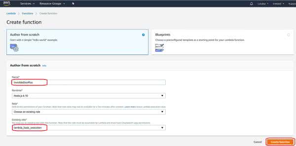 Aby rozpocząć tworzenie nowej funkcji Lambda w oknie zarządzania funkcjami wybieramy opcję Create a function. Powoduje to uruchomienie kreatora tworzenia funkcji Lambda z domyślnie zaznaczoną opcją budowy funkcji według projektu użytkownika (Author from scratch). Wprowadzamy nazwę funkcji (InvisibleDicePlus), definiujemy uprawnienia (rola lambda_basic_execution ) oraz zatwierdzamy utworzenie nowej funkcji (rysunek 15).