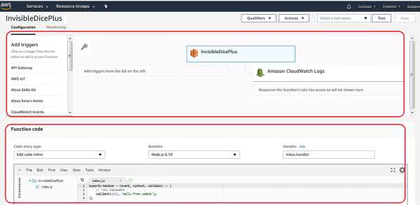 W systemie zostaje utworzona funkcja Lambda oraz jest uruchamiany panel zarządzania funkcją. W panelu zarządzania są dostępne zakładki konfiguracja oraz monitoring. Domyślnie jest uruchomiona zakładka konfiguracji funkcji. Korzystając z dostępnych opcji możemy zdefiniować wyzwalacz funkcji oraz rozpocząć pracę z kodem źródłowym (rysunek 16).