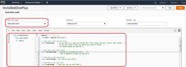 Nasza funkcja zawiera kod programu umiejętności z pierwszej części kursu. Teraz naszym zadaniem będzie zmodyfikowanie kodu źródłowego funkcji i dodanie obsługi wyświetlania obrazów oraz odtwarzania plików audio. W tym celu, ponownie uruchamiamy edytor funkcji Lambda (Services → Lambda → Functions → InvisibleDicePlus) i przechodzimy do edytora kodu źródłowego funkcji (rysunek 20).