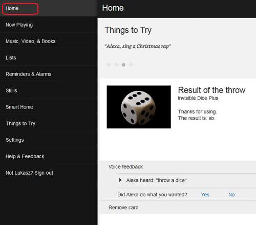 Na potrzeby artykułu skorzystamy z symulatora Echosim oraz z konfiguratora internetowego http://alexa.amazon.com. Uruchamiamy symulator Echosim i wydajemy polecenie rzutu kostką („Alexa, Open invisible dice plus and throw a dice”). Sposób korzystania z symulatora pokazaliśmy w pierwszej części kursu (EP 12/2017 – rysunek 30). W trakcie wykonania polecenia nasza umiejętność Invisible Dice Plus nie zgłasza błędów. Jest odtwarzany plik audio z dźwiękiem rzucanej kostki, a następnie jest podawany wynik rzutu kostką. Żeby sprawdzić poprawność wyświetlania karty domowej logujemy się do konfiguratora http://alexa.amazon.com i wybieramy zakładkę Home. Wygląd karty startowej również jest poprawny (rysunek 22). Oznacza to, że wykonana przez nas umiejętność działa poprawnie i możemy przejść do jej publikacji.