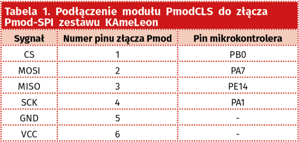 W przykładzie użyto interfejsu SPI, dlatego zworka MD0 powinna być zamknięta, natomiast MD1 i MD2 należy zostawić otwarte. Trzeba również pamiętać o odpowiednim ustawieniu zworki na złączu JP1, aby sygnał SS (Slave Select) złącza J1 był doprowadzony do mikrokontrolera sterującego wyświetlaczem – piny 1 (SS) i 2 (środkowy) złącza JP1 powinny być zwarte. Po takiej konfiguracji modułu, złącze J1 odpowiadające złączu Pmod SPI typu 2. może być dołączone do gniazda Pmod-SPI zestawu Kameleon. Opis połączeń z pinami mikrokontrolera STM32L496ZG umieszczono w tabeli 1.