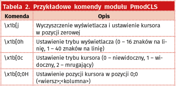 Moduł PmodCLS jest kontrolowany za pomocą komend wysyłanych przez wybrany interfejs. Każda komenda rozpoczyna się sekwencją znaków 0x1b i 0x5b (ESC i ‘[’ w kodzie ASCII), po której następują argumenty i kod komendy. Część z dostępnych komend, wykorzystanych w przykładzie znajduje się w tabeli 2. Komendy zostały poprzedzone sekwencją ‘\x1b[‘. Pełną listę komend można znaleźć na stronie z dokumentacją modułu: http://bit.ly/2CLDJ3W.