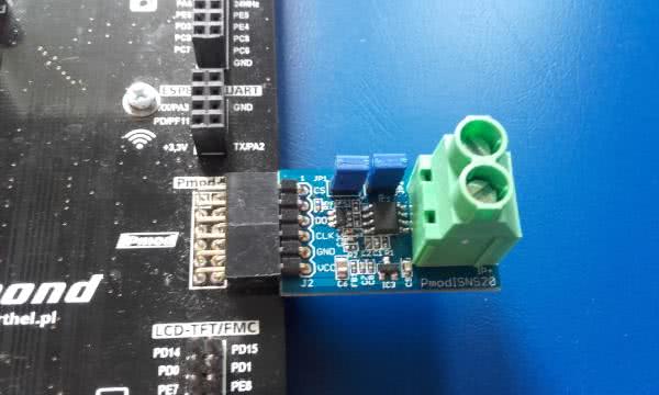 Podobnie jak w wypadku dwóch poprzednich modułów omówionych w artykule, PmodISNS20 powinien zostać przyłączony do złącza Pmod-SPI znajdującego się na płytce KAmeLeon, jak na fotografii 7. Połączenia pinów mikrokontrolera z pinami modułu są zgodne z wymienionymi w tabeli 1.