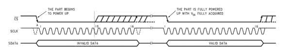 Za pomiar napięcia na wyjściu czujnika ciśnienia jest odpowiedzialny 12-bitowy przetwornik analogowo-cyfrowy z interfejsem SPI typu ADCS7476. Rozpoczęcie konwersji jest inicjalizowane sygnałem CS, który musi być utrzymywany na poziomie niskim aż do końca konwersji następującego na szesnastym, opadającym zboczu sygnału zegarowego SCLK o maksymalnej częstotliwości 20 MHz. Zmiana poziomu sygnału CS na wysoki pomiędzy dziesiątym a szesnastym zboczem sygnału zegarowego powoduje, że układ pozostaje w tym samym trybie, jednak wówczas dane są nieważne. Układ ADCS7476 ma także tryb obniżonego poboru prądu, do którego przechodzi się zmieniając poziom sygnału CS na wysoki przed dziesiątym opadającym zboczem sygnału zegarowego SCLK. Do pomiaru i odczytu wartości napięcia potrzebne są dwa 16-bitowe transfery SPI – pierwszy do przeprowadzenia konwersji, a drugi do transmisji danych, które są przesunięte do prawej strony (najmniej znaczące 12 bitów w słowie 16-bitowym), co pokazano na rysunku 4.