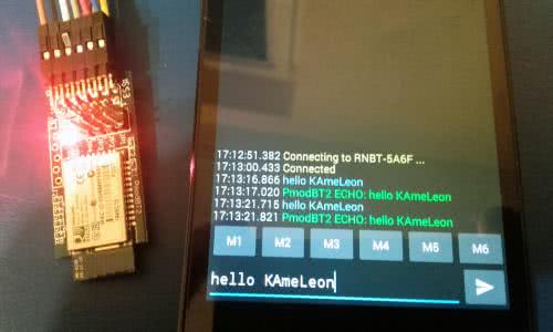 Główna funkcja programu – main, zajmuje się konfiguracją systemu oraz modułu PmodBT2. Następnie odczytywana jest wersja oprogramowania, a odpowiedź układu wysyłana jest na interfejs LPUART1 dostępny jako wirtualny port szeregowy po podłączeniu KAmeLeona do komputera. Na koniec program przechodzi do nasłuchu nadchodzących danych, które automatycznie odsyłane są do nadawcy. Dodatkowo stan połączenia sygnalizowany jest za pomocą diody LED1 podłączonej do pinu PC7. Efekt działania programu można zaobserwować na fotografii 2. Do celów demonstracji została użyta aplikacja Serial Bluetooth Terminal dla systemu Android.