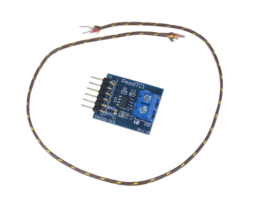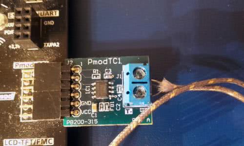 PmodTC1 (fotografia 3) jest modułem do pomiaru temperatury w zakresie od –73°C do 482°C i z dokładnością ±2°C za pomocą termopary. Składa się on z dwóch elementów – termopary typu K oraz układu MAX31855, będącego przetwornikiem z kompensacją temperatury zimnego złącza. Jest to konieczne ze względu na konieczność utrzymywania tzw. zimnych końców termopary w ściśle określonej temperaturze, najczęściej 0°C. Zastosowanie kompensacji usuwa to ograniczenie przez pomiar temperatury otoczenia, która jest jednocześnie temperaturą zimnego złącza.