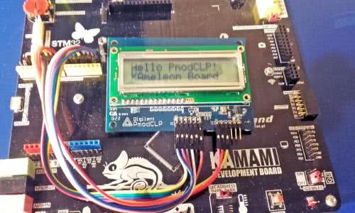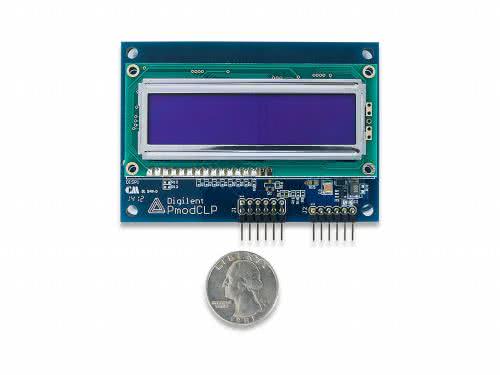 Ostatni z opisywanych w tej części cyklu – PmodCLP (fotografia 6), ma wyświetlacz znakowy LCD zawierający 2 linie po 16 znaków. W roli kontrolera wyświetlacza użyto układu KS0066 firmy Samsung obsługującego wyświetlacze jedno- i dwuliniowe. Komunikacja z nim odbywa się za pomocą interfejsu równoległego, przez który są wysyłane zarówno komendy jak i dane do wyświetlenia.