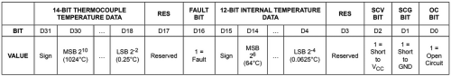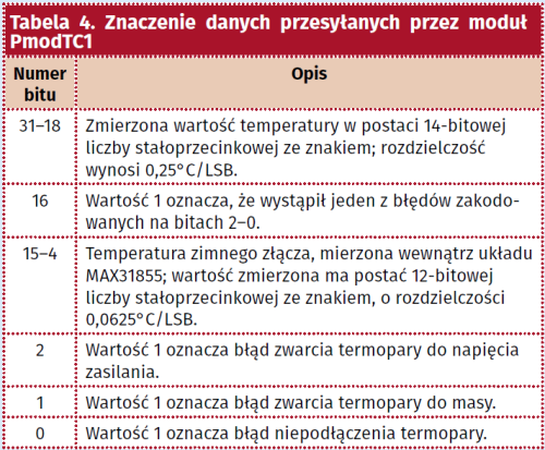 Układ MAX31855 nie wymaga konfiguracji, a odczyt danych odbywa się za pośrednictwem interfejsu SPI. Dane zwracane przez moduł są zakodowane na 32 bitach, tak ja na rysunku 5. Poszczególne pola bitowe zostały wyjaśnione w tabeli 4.