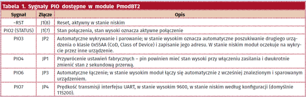 Oprócz sygnałów odpowiedzialnych za komunikację za pośrednictwem interfejsu UART, PmodBT2 udostępnia także kilka linii GPIO do kontrolowania oraz monitorowania pracy układu RN42. Sygnały te zostały przedstawione w tabeli 1.