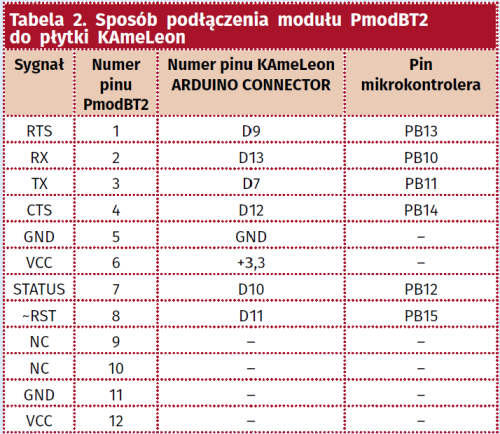 Moduł PmodBT2 ma złącze Pmod dla interfejsu UART, typu 4A. W miejsce sygnału INT został podłączony sygnał STATUS (PIO2), informujący o stanie połączenia. W przykładzie, moduł został podłączony do złącza oznaczonego jako ARDUINO CONNECTOR na płytce KAmeLeon według tabeli 2.
