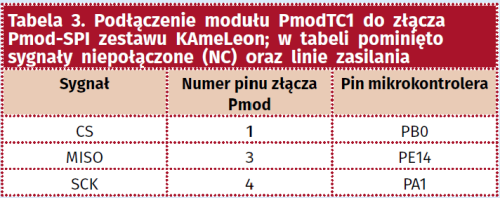 Moduł PmodTC1 ma dwa złącza – J1 do podłączenia termopary oraz J2 z interfejsem SPI. Przy podłączaniu termopary należy zwrócić uwagę na oznaczenia poszczególnych przewodów – kolor oplotu każdego z nich (żółty i czerwony) odpowiadają oznaczeniom obu terminali złącza (T+ YLW, T– RED). Drugie ze złączy odpowiada standardowemu złączu Pmod SPI typu 2, bez sygnału MOSI, ponieważ komunikacja odbywa się tylko w jednym kierunku. Moduł może być podłączony do złącza Pmod-SPI zestawu KAmeLeon, w którym schemat połączenia z pinami mikrokontrolera wygląda tak, jak zostało to przedstawione w tabeli 3. Podłączony moduł jest widoczny na fotografii 4.