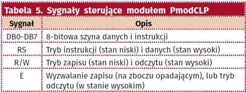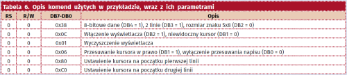 Wyświetlenie napisu jest możliwe przez zapis do pamięci DDRAM za pośrednictwem interfejsu równoległego, którego sygnały przedstawiono w tabeli 5. Za jego pomocą można także konfigurować wyświetlacz wysyłając do niego instrukcje. Część dostępnych instrukcji, użytych w przykładzie, razem z wybranymi parametrami została przedstawiona w tabeli 6. Szczegóły dotyczące wszystkich instrukcji oraz ich struktury znajdują się w dokumentacji modułu, na stronie: http://bit.ly/2SfhLLy