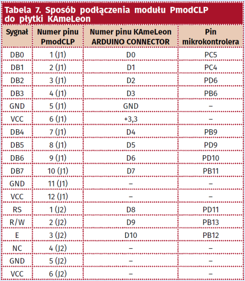 Ze względu na dużą liczbę sygnałów, moduł PmodCLP został w przykładzie podłączony do złącza ARDUINO CONNECTOR według tabeli 7. W przykładzie używane są tylko komendy do zapisu danych i instrukcji, dlatego piny mikrokontrolera mogą być skonfigurowane wyłącznie jako wyjścia.