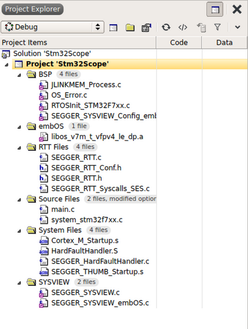 W tym miejscu warto wspomnieć o zarządzaniu plikami w środowisku Embedded Studio. Wszystkie pliki dodane do projektu są wyświetlane po lewej stronie, w oknie nazwanym Project Explorer. Dodatkowo ścieżki plików w projekcie nie muszą odpowiadać lokalizacji plików na dysku, dzięki czemu możemy dowolnie grupować źródła znajdujące się bezpośrednio w katalogu projektu jak i poza nim. W prezentowanym przykładzie wszystkie niezbędne pliki zostały skopiowane do katalogu projektu, aby po rozpakowaniu można go było zbudować bez dodatkowych zależności.