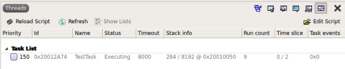 Na koniec tego rozdziału zobaczymy jeszcze, w jaki sposób można zdobyć informację o zdefiniowanych zadaniach i wykorzystywanej przez nie pamięci. Do tego celu potrzebujemy skryptu embOSPluginSES.js, znajdującego się w katalogu BSP/ST/STM32F746_STM32F746G_Discovery/Setup w pakiecie ewaluacyjnym. Ścieżkę do niego musimy podać w opcjach projektu, w polu Debugger Threads Script File (w przykładzie jest to $(ProjectDir)/embOSPluginSES.js). Teraz, podczas debugowania kodu, za każdym razem, kiedy zatrzymamy program, w oknie Threads (dostępnym w menu View More Debug Windows Threads lub po wciśnięciu klawiszy Ctrl+Alt+H) zobaczymy listę zadań wraz z takimi informacjami jak ich stan oraz zużycie pamięci, co zostało pokazane na rysunku 3.