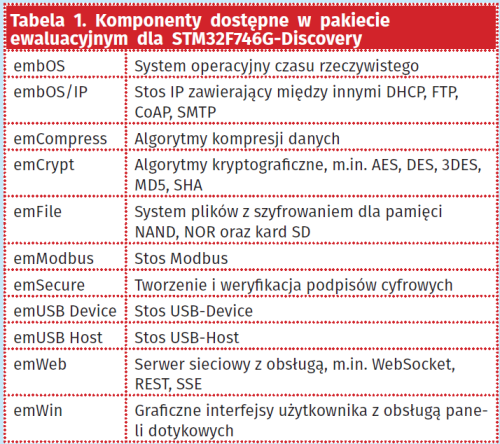 Pracę z narzędziami firmy Segger warto zacząć od pobrania pakietu bibliotek wraz z przykładami skonfigurowanymi dla jednego z dostępnych zestawów ewaluacyjnych. Listę wspieranych modułów można znaleźć na stronie http://bit.ly/2VOk2zw. Znajduje się tam między innymi pakiet dla STM32F746G-Discovery od ST, wraz z bibliotekami wymienionymi w tabeli 1.