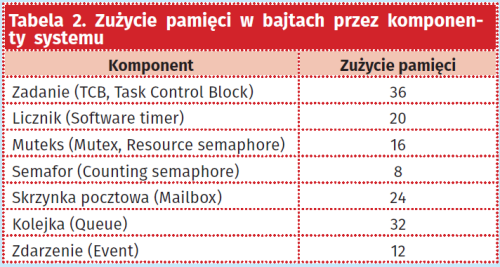 Mimo różnic w implementacji, przenoszenie aplikacji pomiędzy systemami FreeRTOS i embOS jest stosunkowo proste, ponieważ zasada obsługi zadań, jak i komunikacji pomiędzy nimi pozostaje taka sama. Odpowiadające sobie typy danych i wywołania obu systemów operacyjnych użyte w przykładzie zostały przedstawione w tabeli 4. W tabeli pominięto wywołania związane z obsługą kolejek i liczników programowych, ponieważ nie zostały one użyte w kodzie programu po migracji. Tabela pomija również kwestie inicjalizacji sprzętu – w systemie embOS jest za to odpowiedzialna funkcja OS_InitHW(), zdefiniowana w pakiecie ewaluacyjnym i użyta w kodzie na listingu 1. Konfiguruje ona m.in. kontroler przerwań NVIC, zegar systemowy oraz pamięci podręczne. W przypadku systemu FreeRTOS inicjalizacja części peryferii oraz biblioteki HAL odbywa się zaraz na początku funkcji main, niezależnie od systemu, natomiast SysTick jest konfigurowany w ramach kodu zależnego od platformy i znajdującego się w pliku port.c.