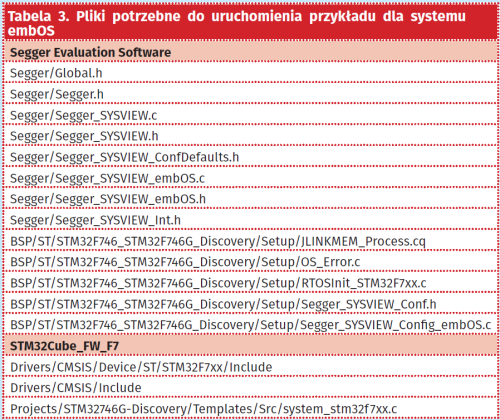 Do przykładu została wybrana wersja libos_v7m_t_vfpv4_le_dp.a, skompilowana z flagą kompilatora DEBUG=1. Wybrana biblioteka musi być także zaznaczona w pliku OS_Config.h, poprzez zdefiniowanie odpowiednio OS_LIBMODE_SP, OS_LIBMODE_R lub OS_LIBMODE_DP. Oprócz samej biblioteki do projektu trzeba także dodać ścieżkę do plików nagłówkowych „./OS/Inc”, klikając prawym przyciskiem myszy na nazwę projektu w oknie Project Explorer, wybierając opcję Options… i modyfikując pole Preprocessor → User Include Directories. Oprócz biblioteki embOS i jej nagłówków musimy dodać do projektu kilka innych plików znajdujących się w pakiecie ewaluacyjnym Seggera i w bibliotece STM32Cube. Potrzebne pliki i katalogi zostały umieszczone w tabeli 3.