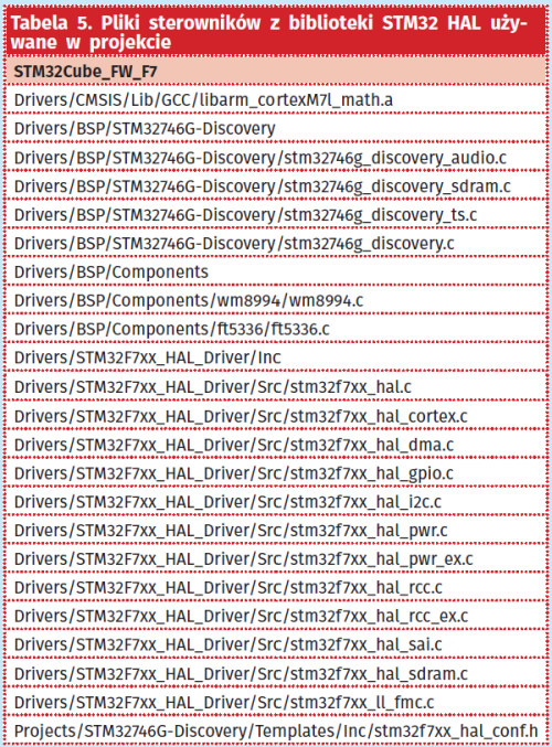 Po wykonaniu niezbędnych zmian w oryginalnym kodzie trzeba jeszcze dodać kolejne ścieżki i pliki w ustawieniach projektu. Znajdują się one w tabeli 5. Są to pliki niezbędne do obsługi peryferii mikrokontrolera, pamięci SDRAM, wyświetlacza oraz panelu dotykowego. Na potrzeby przykładu użyte zostały sterowniki dostarczane razem z biblioteką STM32Cube. Do projektu musimy dodać także wymienioną w tabeli bibliotekę matematyczną ARM. Wymaga ona zdefiniowania symbolu ARM_MATH_CM7 w ustawieniach projektu (Preprocessor → Preprocessor Definitions). Pozwala on na dodanie odpowiednich plików nagłówkowych z biblioteki CMSIS.