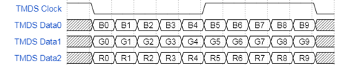 Dane w interfejsie HDMI przesyłane są dla każdego koloru osobnym kanałem. Głębia koloru w standardzie HDMI 1.0 to 24 bity, czyli po 8 bitów na jeden kolor. W kanale koloru niebieskiego dodatkowo są kodowane 2 sygnały synchronizacyjne – synchronizacja pionowa i pozioma. Można więc powiedzieć, że HDMI to nic innego, jak przesłanie danych identycznych jak za pomocą interfejsu VGA tyle, że w postaci cyfrowej. Nawet sposób opisu zależności czasowych jest taki sam, jak dla VGA.