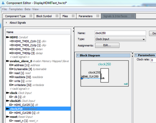 Jedną uwagą, którą chciałbym jeszcze przekazać, jest informacja na temat ustawienia Clock rate. Wpisanie tam wartości 0 powoduje, że Platform Designer nie zwraca uwagi na to, jaki sygnał zegarowy podepniemy. Wpisanie tu innej niż zero wartości (wyrażonej w Hz) powoduje, że oprogramowanie będzie weryfikować, czy podłączony sygnał ma taką częstotliwość, jak wpisana przez nas w tym okienku. Dla naszego układu moglibyśmy zatem wpisać dla odpowiednich wejść sygnału zegarowego pożądane częstotliwości 25 i 250 MHz, wyrażone w Hz. Po tym zapisujemy moduł i… prawie gotowe!