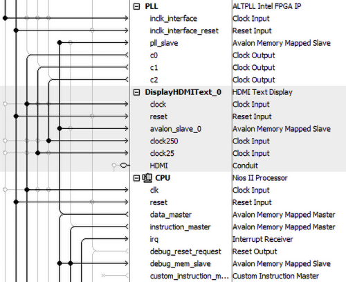 Dodajmy nasz moduł do podstawowego systemu (rysunek 7). Zabraknie nam oczywiście odpowiednich sygnałów zegarowych. Aby je wygenerować, otwieramy właściwości naszej pętli PLL i na wyjściach c1 oraz c2 generujemy częstotliwości 25 i 250 MHz. Dodatkowo, zmniejszamy rozmiar pamięci RAM naszego procesora na 16 384 bajty (inaczej pamięci modułu HDMI nie zmieszczą się w układzie – alternatywnie możemy i tu podzielić adresy pikseli i mieć 4-krotnie mniejszą liczbę znaków o większych pikselach, ale za to zachować więcej pamięci dla procesora). Następnie możemy standardowo dołączyć nowy komponent, wyeksportować interfejs HDMI i wykonać czynności zmierzające do przypisania pinów układu FPGA. Zanim jednak klikniemy na Analysis&Synthesis, musimy w Assignments → Device → Device and Pin Options… → Configuration ustawić Configuration mode na Single Uncompressed Image with Memory Initialization. Inaczej nie będzie możliwe zainicjalizowanie pamięci ROM znaków.