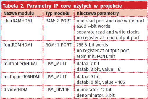 Zostało jeszcze utworzenie głównego pliku sterownika, który będzie generował odpowiednią adresację pikseli oraz nadawał dane za pomocą interfejsów różnicowych (listing 3). W tabeli 2 umieszczono zebrane w jednym miejscu parametry wykorzystanych IP Core w projektowanych przez nas modułach. Dodanie sufiksu HDMI jest w 100% celowe w tych nazwach – pozwoli to na uniknięcie ewentualnych problemów w sytuacji, gdyby ktoś chciał kiedyś użyć tych modułów jednocześnie.