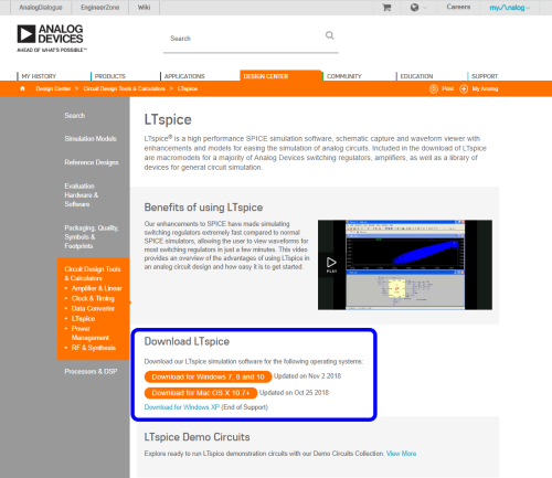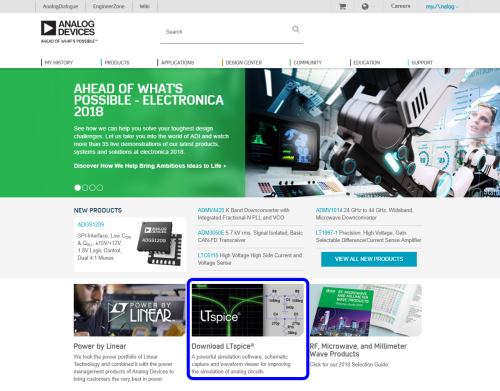 Program LTspice można pobrać ze strony www.analog.com [2]. Aby tego dokonać, należy kliknąć w link znajdujący się w dolnej części witryny (rysunek 1). Przekieruje on nas na stronę poświęconą samemu LTspice, gdzie znajdują się odnośniki do źródeł (rysunek 2).