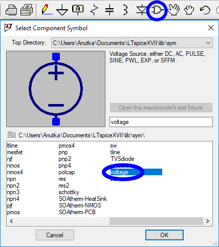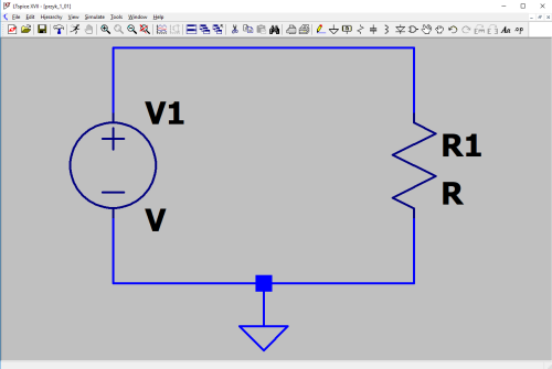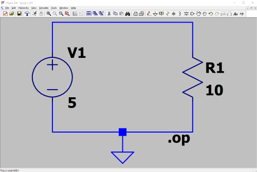 V(n001) oznacza napięcie na węźle łączącym dodatnią końcówkę źródła V1 z rezystorem R1. Nazwa n001 została utworzona automatycznie przez edytor schematów. Oczywiście, można samemu nadać nazwy węzłom poprzez użycie ikonki nazwa węzła lub wybranie menu Edit → Label Net albo skrótu klawiszowego F4.