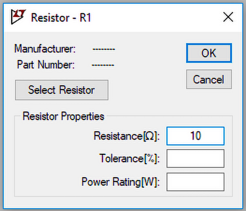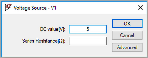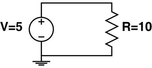 Prawdopodobnie najprostszym obwodem, który można sobie wyobrazić, jest rezystor dołączony do źródła napięcia stałego, jak na rysunku 5. Przykładowo może to być wyidealizowany schemat zastępczy żarówki zasilanej z baterii. Należy zwrócić uwagę, że symbol rezystora w tego typu programach jest inny niż ogólnie przyjęty kształt prostokąta.