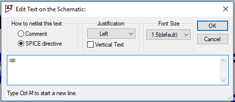 Czy możemy już uruchomić symulację? No prawie. Jeszcze tylko musimy programowi SPICE jakoś powiedzieć, co ma policzyć. Między innymi do tego celu służą dyrektywy. Dlatego teraz klikamy na ikonkę z tekstem „.op” i w puste pole wpisujemy… właśnie .op (rysunek 10) i zatwierdzamy przyciskiem OK. Gotowy schemat zamieszczono na rysunku 11.