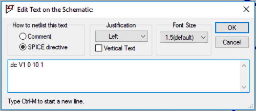 Kolejnym rodzajem symulacji, którego można się nauczyć już na tak prostym obwodzie, jest analiza stałoprądowa „.DC”. Podobnie jak poprzednia, ta analiza również oblicza stałe wartości napięć i prądów, jednak nie informuje o małosygnałowych parametrach elementów nieliniowych. Umożliwia za to wykonanie obliczeń przy zmianie wartości napięcia/prądu w zastosowanym źródle. W naszym wypadku zmianie będzie ulegało napięcie źródła V1 w zakresie 0…10 V z krokiem co 1 V (rysunek 14). Aby zdefiniować takie zachowanie źródła, należy najpierw usunąć zdefiniowaną w poprzednim przykładzie dyrektywę .op (na przykład za pomocą ikonki wytnij – cut), a następnie dodać nową (np. za pomocą ikonki z napisem .op) .dc V1 0 10 1. Informuje ona program SPICE, że ma on zamienić zadeklarowaną wartość źródła V1 z 5 V na wartości kolejno 0, 1, 2, … 10 V i dla każdej z nich wykonać symulację.