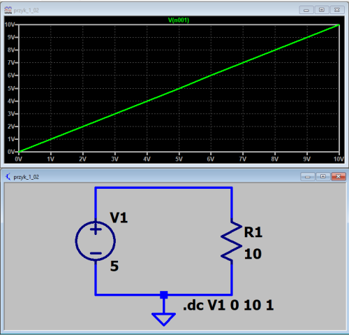 Ogólnie, źródła napięcia stałego definiuje się poprzez Vnazwa_źródła węzeł_dodatni węzeł_ujemny wartość lub Vnazwa_źródła węzeł_dodatni węzeł_ujemny DC wartość. Słowo DC oznacza deklarację źródła napięcie stałego i można je pominąć. Rezystor o oporze 10 Ohm jest definiowany w bardzo podobny sposób: R1 N001 0 10, co można zapisać ogólnie jako Rnazwa_rezystora węzeł_dodatni węzeł_ujemny wartość. Kolejna linia zawiera deklarację analizy stałoprądowej (.dc V1 0 10 1), a poszczególne pola oznaczają .dc Vnazwa_źródła wartość_początkowa wartość_końcowa krok. Oczywiście analizę stałoprądową można także zdefiniować dla źródeł prądowych, o których jeszcze nie wspominaliśmy, a także dla wielu źródeł jednocześnie, na przykład .dc V1 0 10 1 I1 0 2 0.1.