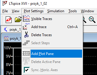 Po zakończeniu wykonywania analizy można, jak poprzednio, kliknąć lewym przyciskiem myszy na połączeniu między dodatnią końcówką V1 i rezystorem. W tym wypadku, zamiast pokazania wartości napięcia przy tym połączeniu na schemacie, zostanie wyświetlony wykres zależności napięcia V(n001) od wartości napięcia V1 (rysunek 15). W zależności od tego, czy jest aktywne okno schematu, czy wykresu, zmienia się menu programu. Aby wykreślić wartość prądu płynącego przez rezystor, można najpierw utworzyć nowy wykres poprzez wybranie Add Plot Pane z menu Plot settings (rysunek 16), oczywiście gdy jest aktywne okno wykresu. Następnie klikamy lewym przyciskiem myszy na tym elemencie – powoduje to użycie sondy prądowej (rysunek 17). Do wykresu zostanie dodana charakterystyka poboru prądu w zależności od napięcia V1 (rysunek 18).