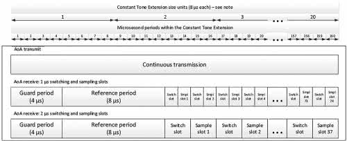Pierwsze 4 ms są przeznaczone na okres bezpieczeństwa (guard). Następne 8 ms to okres odniesienia (reference period). Potem występuje seria par szczelin czasowych (slot) przełączania i próbkowania. Szczeliny czasowe mogą mieć szerokość 1 ms lub 2 ms. Organizacja tonu ciągłego typu AoD CTE jest podobna jak dla odbiornika typu AoA CTE.