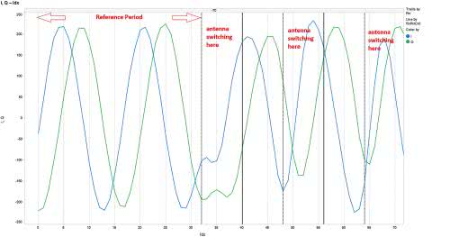 Rysunek jest ilustracją najlepszego sposobu pokazania uzyskania danych. I tak na rysunku 3 pokazano próbki ADC sygnałów z kanału I oraz z kanału Q [9]. Próbkowanie jest wykonywane w sposób ciągły z częstotliwością 4 MHZ (okres 0,25 ms). Dane za czas 128 ms są zbierane do bufora. Na osi poziomej jest pokazany indeks próbki ADC, gdzie indeks 0 (zero) przypada na początek okresu odniesienia (8 ms). Na okres odniesienia przypadają pierwsze 32 próbki IQ. W tym obszarze sygnał wygląda jak przebieg sinusoidalny. Od próbki 32 następuje przełączanie anteny i w sygnale widać nieciągłość. Czas ustalania sygnału wynosi 0,25 ms. Dalej przez cały okres próbkowania (szczelina próbkowania) sygnał jest stabilny. W następnym oknie czasowym jest wykonywane przełączanie na kolejną antenę. I tak cyklicznie do końca tonu ciągłego.