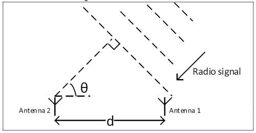 Bardzo uproszczony przykład działania dla matrycy składającej się z dwóch anten pokazano na rysunku 5. Fala radiowa tonu ciągłego typu AoA nadawanego przez nadajnik najpierw dociera do anteny 1, a potem do anteny 2 odbiornika. Przesunięcie fazy odbieranego przez anteny sygnału określa odstęp czasu (rysunek 6). Przy stałej prędkości propagacji fal radiowych daje to długość boku trójkąta prostokątnego przylegającego do kąta odbioru u (rys. 5). W specyfikacji Bluetooth v5.1 jest podany bardzo podstawowy sposób estymacji tego kąta [1]. Przy znanej odległości pomiędzy antenami wystarczy do określenia kąta odbioru u policzyć arcus cosinus. Odbiornik wykonuje próbkowanie kwadraturowe i wykonuje obliczenia kąta odbioru.