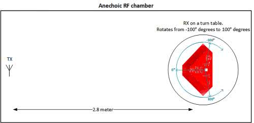 Na rysunku 11 pokazano ustawienie zestawu BOOSTXL-AoA w komorze bezechowej. Nadajnik został umieszczony w odległości 2,8 m od odbiornika (matryc anten). Podczas testów zestaw BOOSTXL-AoA z antenami był obracany tak, że sygnał wejściowy przychodził z kierunku przesuniętego od -100° do 100° [8].