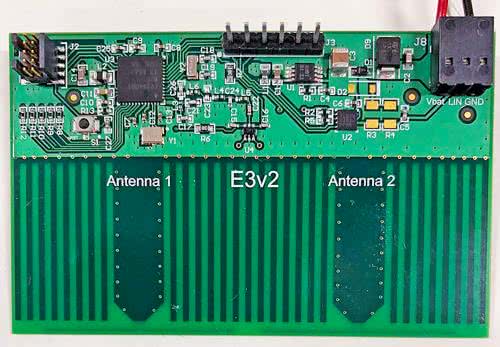 Firma Texas Instruments udostępnia projekt referencyjny TIDA-01632 systemu przeznaczonego do lokalizacji kluczyków samochodowych [13]. Zastosowany został tam układ scalony SimpleLink CC2640R2F-Q1 ze specyfikacją „automotive”. System realizuje metodę AoA z zastosowaniem tylko dwóch anten dipolowych (rysunek 13). Do obliczeń triangulacji i trilateracji jest wykorzystywana firmowa biblioteka Real Time Locationing System (RTLS) Toolbox. Obliczone wartości RSSI oraz kąta są wysyłane poprzez łącze LIN do systemu komputerowego samochodu. Płytka drukowana systemu ma rozmiary 45,72 mm × 76,2 mm. System charakteryzuje się bardzo małym poborem mocy do 24 mA (14 V) w stanie uśpienia.