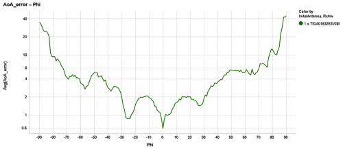 Błąd pomiaru kąta obrotu systemu TIDA-01632 mierzony w komorze bezechowej z wykorzystaniem wartości średniej pomierzonej dla 13 różnych kanałów BLE pokazano na rysunku 14. Dla matrycy dwóch anten dipolowych udało się uzyskać błąd poniżej 10º dla kątów w zakresie ±80º. Jest to dużo gorszy rezultat niż w przypadku zastosowania ortogonalnej matrycy anten.