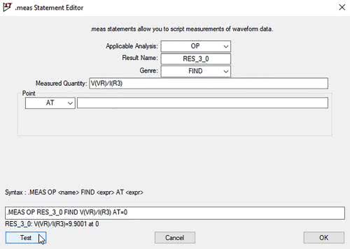 LTspice ma ciekawą opcję. Po napisaniu samej deklaracji .MEAS i umieszczeniu jej na schemacie, możemy, poprzez kliknięcie na niej prawym przyciskiem myszy, otworzyć nowe okno, które umożliwi uzupełnianie definicji pomiaru (rysunek 2). Co więcej, znajduje się tam przycisk Test umożliwiający sprawdzenie działania tworzonego przez nas pomiaru.
