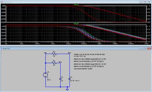 Aby zweryfikować współczynnik temperaturowy pojemności, stwórzmy układ składający się z dwóch filtrów dolnoprzepustowych (rysunek 3). W pierwszym zarówno rezystor (1 kV), jak i kondensator (1 nF) są niezależne od temperatury, a w drugim jedynie pojemność ma wskazaną wartość współczynnika TC (C2 NC2 0 1n TC=1e-2). Pomiar wartości pojemności będzie dokonany pośrednio poprzez pomiar częstotliwości granicznych: