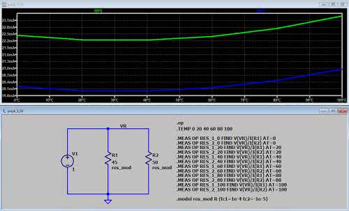 Słowo OP oznacza, że pomiar będzie dokonany podczas analizy .OP, nazwy RES_3_0, RES_3_10, … utworzono z nazwy rezystora R3 i dopełniono wartością temperatury. Słowo FIND pozwala na znalezienie (obliczenie) ilorazu napięcia w węźle VR i prądu płynącego przez opornik R3 (czyli de facto wartości rezystancji), gdy zmienna niezależna przyjmuje wartość sprecyzowaną wyrażeniem AT=wartość. Oczywiście zaleca się utworzenie podobnych pomiarów dla pozostałych rezystorów.