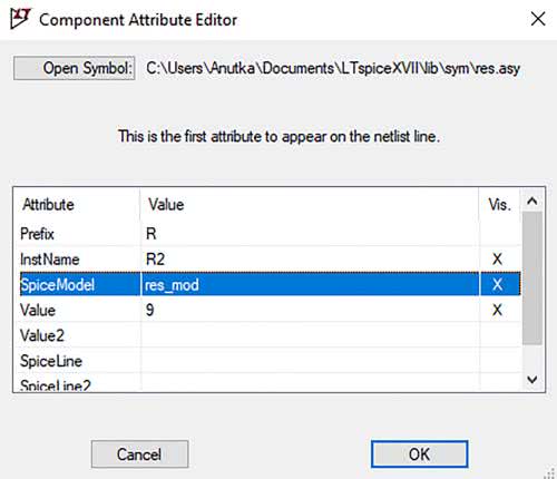 Żeby podać nazwę modelu, należy kliknąć na danym elemencie prawym przyciskiem myszy przy jednoczesnym wciśnięciu klawisza Ctrl. Pojawi się wówczas okno edycji atrybutów elementu (rysunek 6). Można też zaznaczyć, aby nazwa modelu była widoczna na schemacie (znak X pod napisem Vis. - visible).