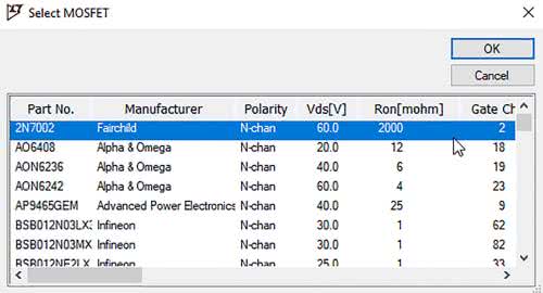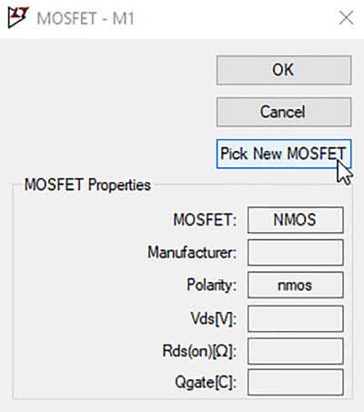 Sposób dołączania do analizy takiego modelu zostanie zobrazowany na przykładzie wykonywania charakterystyk przejściowych i wyjściowych dyskretnego tranzystora MOSFET 2N7002. Tworzenie schematu rozpoczynamy od wstawienia tranzystora MOSFET, na przykład za pomocą skrótu klawiszowego F2. Klikamy w symbol prawym przyciskiem myszy i w oknie właściwości tranzystora wybieramy Pick New MOSFET (wybierz nowy tranzystor MOSFET), rysunek 7. Otworzy się nowe okno wyboru tranzystora MOSFET z dostępnej listy elementów, w którym odnajdujemy i wybieramy tranzystor 2N7002 (rysunek 8).