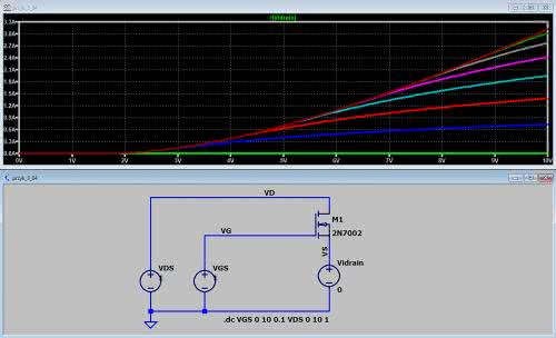 Następnie uzupełniamy schemat źródłami napięć stałoprądowych w każdej gałęzi pomiędzy końcówkami tranzystora i masą, przy czym wartości napięć VDS i VGS można ustawić na 1 V (te wartości będą zmieniane podczas analizy), a źródło napięcia w gałęzi dren-masa ma mieć wartość 0 V. Posłuży ono do pomiaru prądu wypływającego z drenu do masy (węzeł 0). By uzyskać charakterystyki przejściowe ID=ID(VGS), wykonujemy analizę stałoprądową .DC, w której najpierw deklarujemy zmianę źródła VGS, a następnie VDS, rysunek 9 i poniższa netlista do przykładu przyk_3_04.asc. Charakterystyki otrzymuje się poprzez kliknięcie na źródle napięcia Vidrain, co spowoduje wyświetlenie wartości prądu płynącego przez to źródło napięcia - czyli prądu drenu.