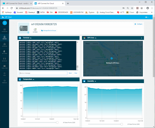 Trzeba pamiętać, że pobieranie danych z zestawu Thingy:91 do chmury serwisu powoduje zużywanie predefiniowanej puli darmowego transferu danych, która bardzo szybko się zużywa. Całość działa w sposób automatyczny, jednak jeśli chcemy zobaczyć szczegóły dotyczące sposobu pracy połączenia LTE to trzeba użyć innego programu.