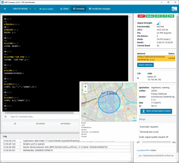 Jeśli nie ma dostępu do obsługi mobilnego IoT to w prawym górnym rogu okna aplikacji pulsuje kolorami pole LTE, co wskazuje na poszukiwanie sieci LTE. I nic więcej nie da się zrobić. Na dole okna aplikacji jest okno Log w którym pokazywane są informacje oraz komunikaty o błędach. W prawym panelu okna pokazywane są informacje dotyczące modemu oraz sieci komórkowej. Pierwsza linia pokazuje kolorami stan połączenia. Najechanie myszką na pole powoduje wyświetlenie listy dostępnych kolorów oraz ich znaczenie. Poniżej są pokazywane szczegółowe informacje, zaczynając od siły sygnału radiowego, używanego kanału LTE (20, 791...849 MHz), oraz danych właściciela sieci LTE (Orange) i stanu/typu połączenia komórkowego (roaming). Kliknięcie na przycisk Show servising station location powoduje wyświetlenie okna z informacją o lokalizacji używanej stacji bazowej wraz z mapką zasięgu (rysunek 5). Na zakładce Chart pokazywany jest wykres on-line pokazujący zdarzenia oraz siłę sygnału RSRP (dBm).