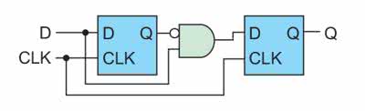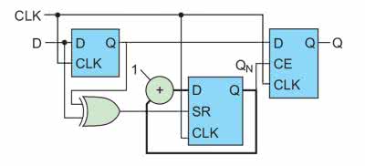 Wejściowy rejestr na każdym narastającym zboczu zegara zapisuje stan z wejścia D. Dzięki temu na jego wejściu mamy aktualną, a na wyjściu poprzednią wartość. Jeżeli jest ona stabilna oba wejścia bramki ex-or będą miały taką samą wartość. Zmiana stanu wejściowego spowoduje, że przez jeden cykl będą się one różnić, co pociągnie wystawienie na jej wyjściu jedynki logicznej i reset licznika. Gdy jednak stała wartość utrzyma się dostatecznie długo doliczy on w końcu do wartości 2N-1, (przy założeniu, że ma on długość N). Nastąpi wtedy odblokowanie trzeciego przerzutnika i wystawienie nowej wartości na wyjście Q. Jeżeli wartość wejściowa jest stała licznik będzie zliczał „w kółko”, a rejestr wyjściowy będzie aktywny przez połowę czasu. Jednak nie ma to znaczenia, ponieważ w przypadku zmiany stanu wejścia D licznik zostanie zresetowany, a na wejściu CE pojawi się stan niski, zanim nowa wartość zostanie zatrzaśnięta.