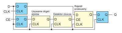 Pewnym niuansem pominiętym w tym projekcie jest nieuwzględnienie opóźnienia wprowadzonego przez filtrację drgań (2N+1 cykli zegara) oraz wykrywanie zbocza (1 cykl zegara). Tak więc sygnał na wejściu CE będzie opóźniony względem wejścia D o 2N+2 cykli zegara. W naszym przypadku nie zakłóci to działania, ponieważ „opóźnienia” wprowadzone przez przesuwającego przełączniki człowieka są dużo większe. Jednak w ogólnym przypadku należy zadbać o to, aby spotykające się sygnały miały względem siebie „odpowiednie” opóźnienie (tzw. latencję). Dodatkowo na wejściu i wyjściu dodane zostały rejestry, które pozwolą narzędziom na łatwiejsze rozłożenie elementów w strukturze układu FPGA.